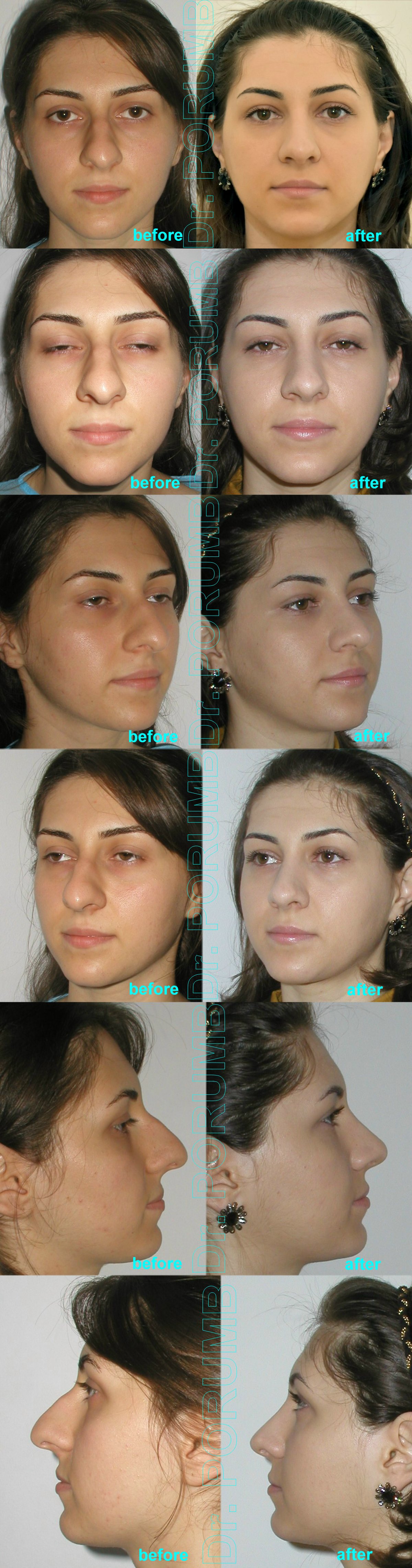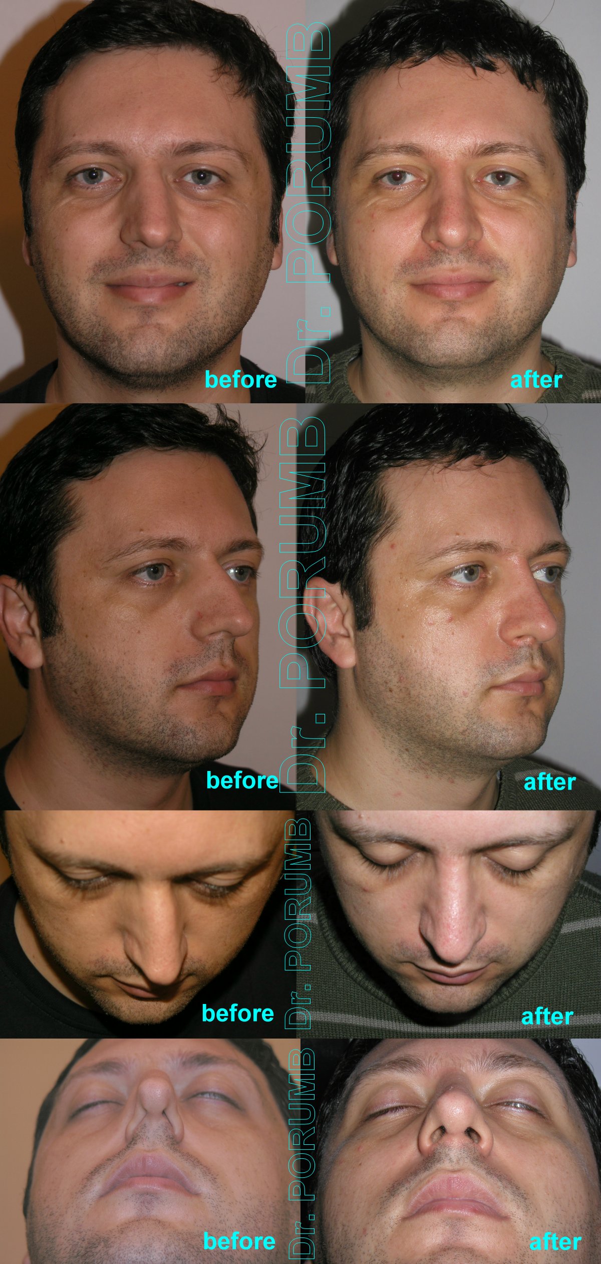 Aceste fotografii arata multiplele tipuri de rinoplastii practicate de Dr Porumb Serban. Fotografiile inainte si dupa operatie sunt cea mai buna metoda da va face o idee despre ce fel de rezultate sa va asteptati daca veti face o interventie cu Dr Porumb Serban, toate cazurile fiind operate in exclusivitate de dansul, de la inceputul pana la sfarsitul operatiei.