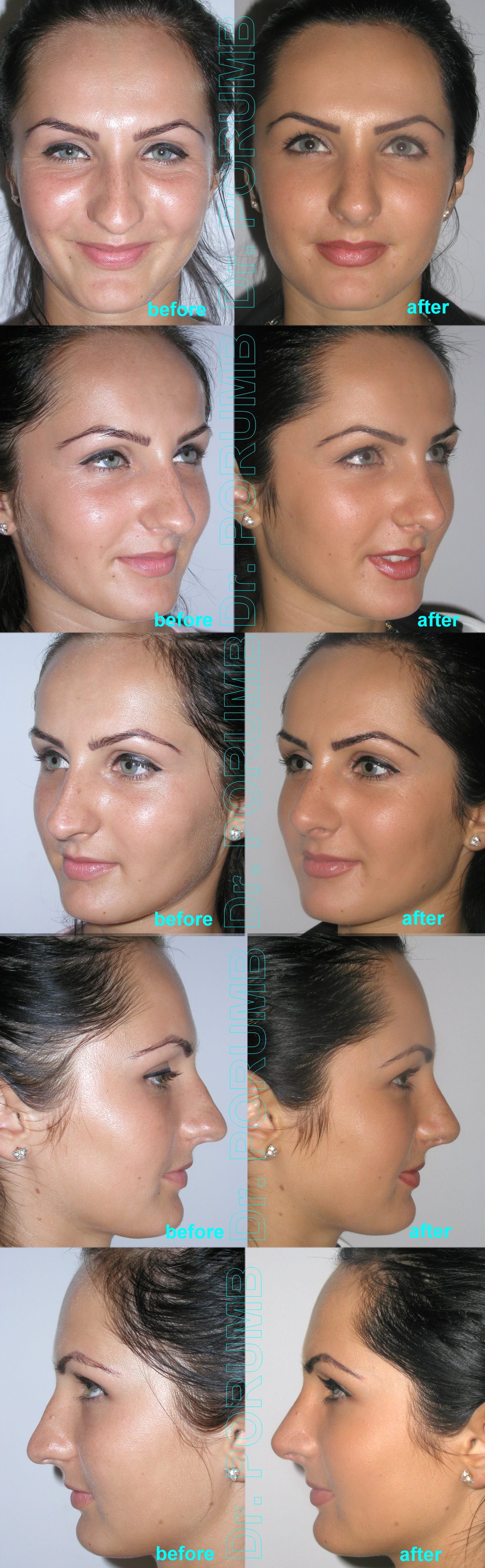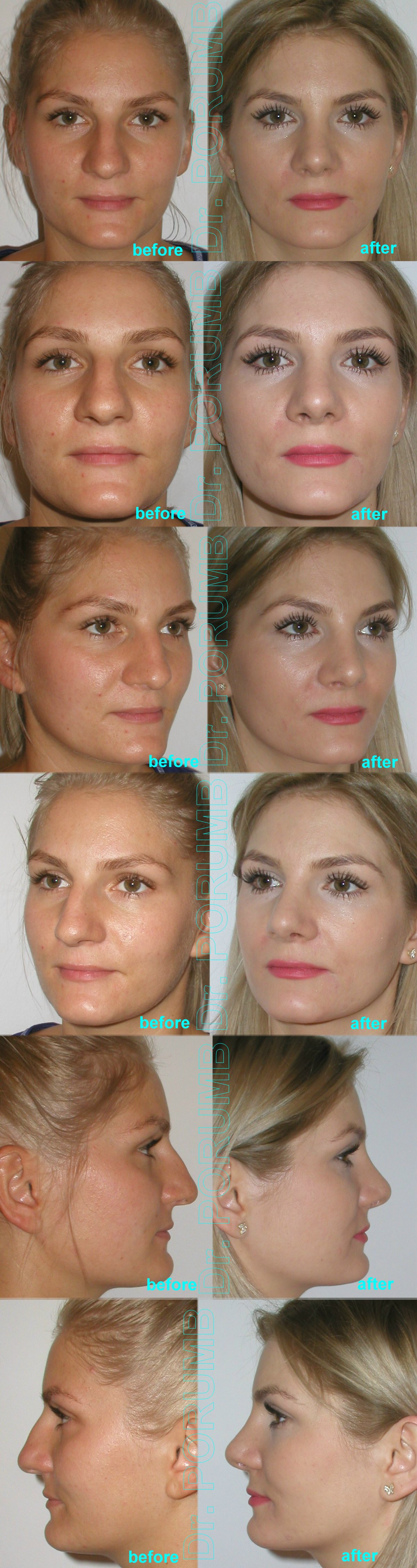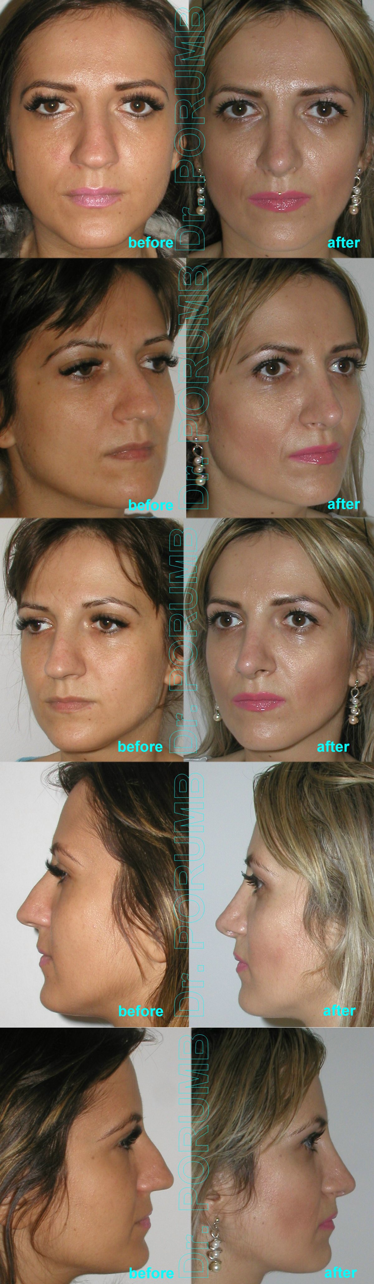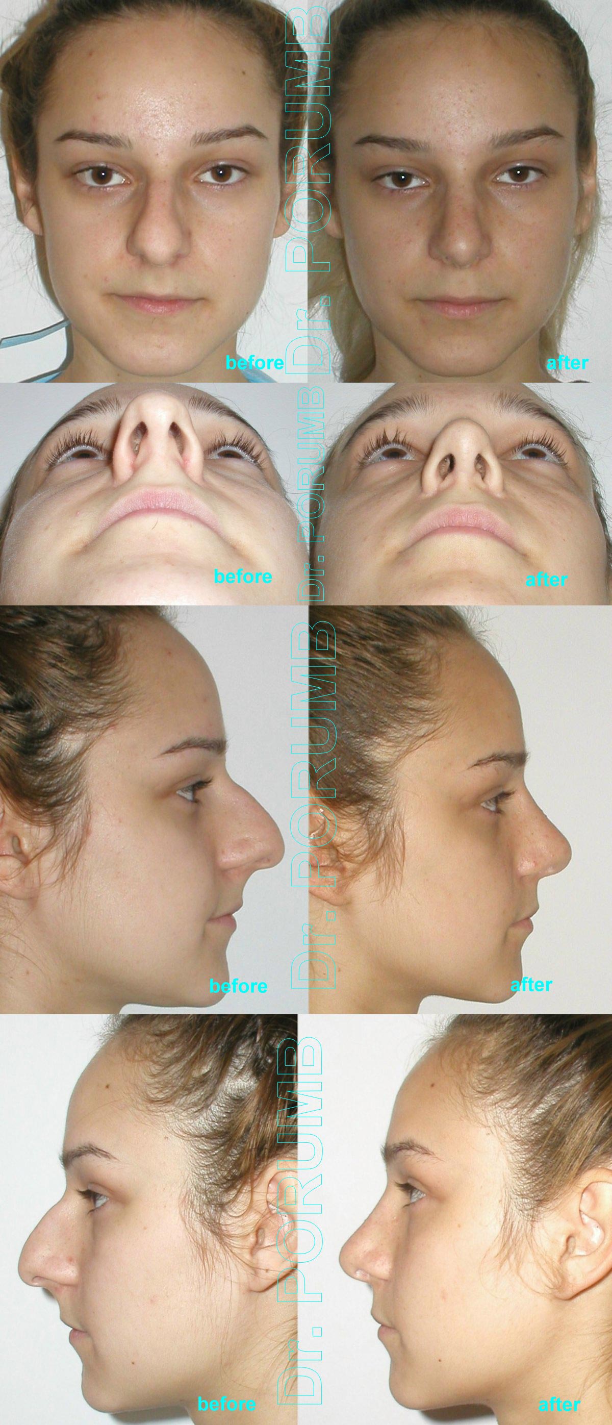 Aceste fotografii arata multiplele tipuri de rinoplastii practicate de Dr Porumb Serban. Fotografiile inainte si dupa operatie sunt cea mai buna metoda da va face o idee despre ce fel de rezultate sa va asteptati daca veti face o interventie cu Dr Porumb Serban, toate cazurile fiind operate in exclusivitate de dansul, de la inceputul pana la sfarsitul operatiei.