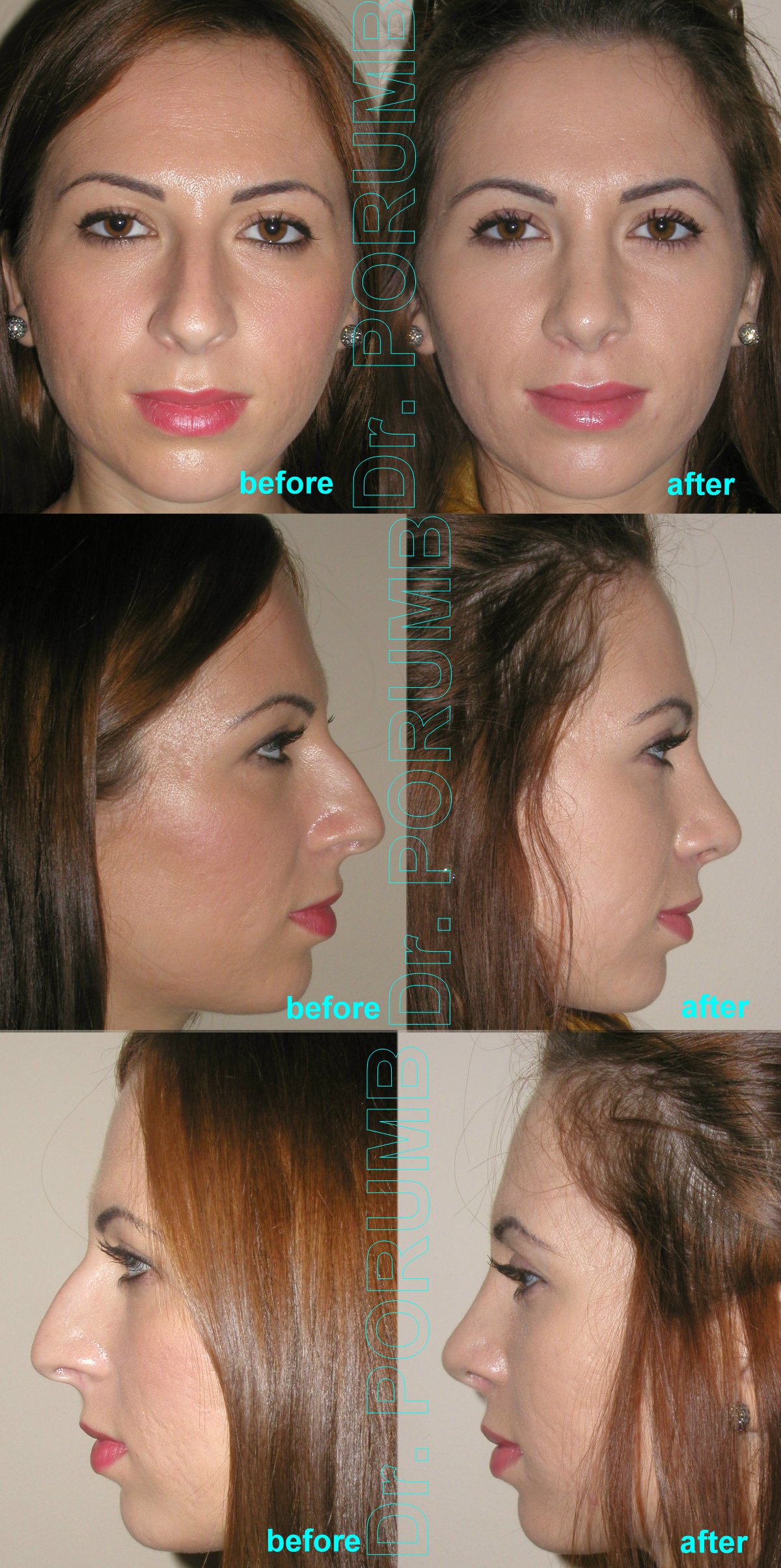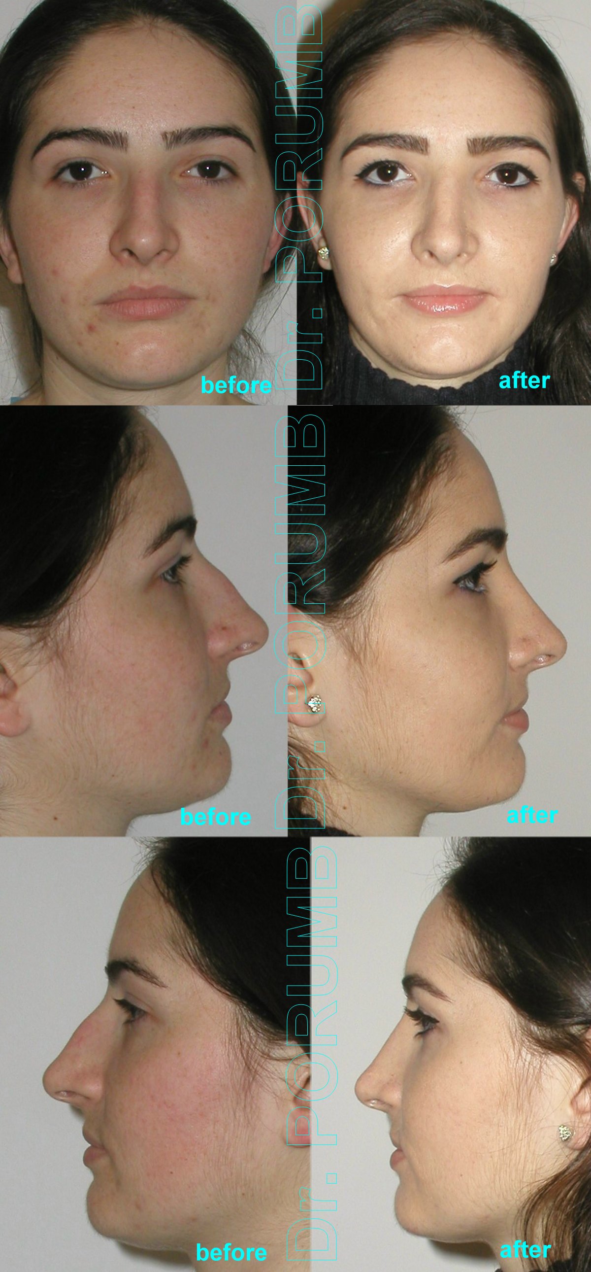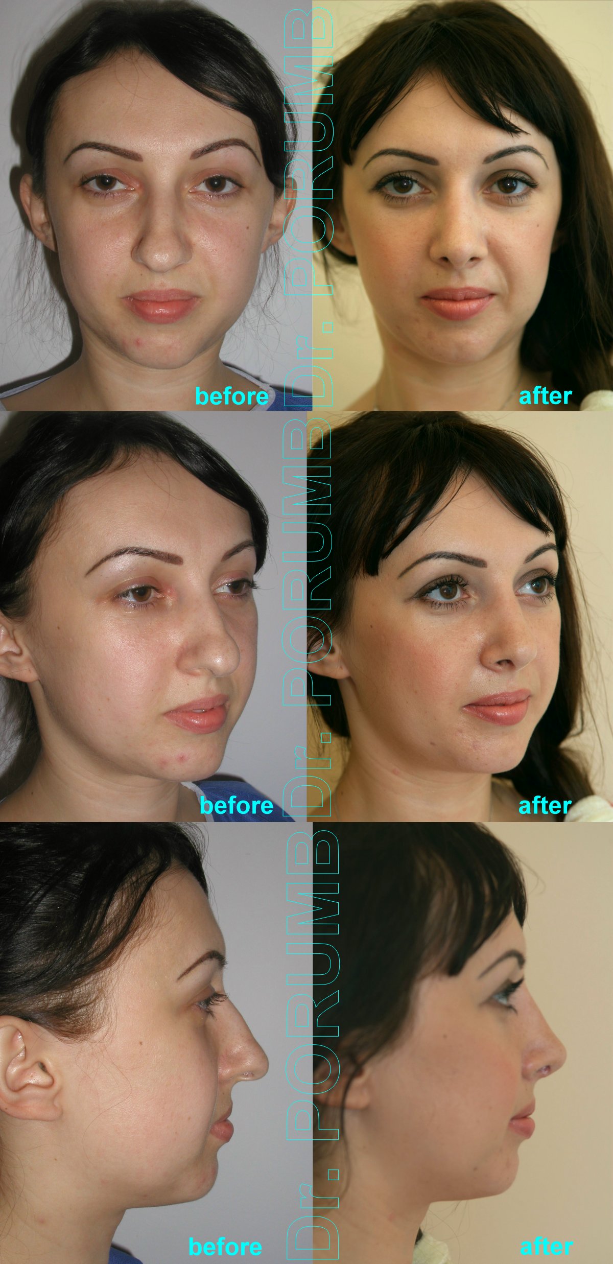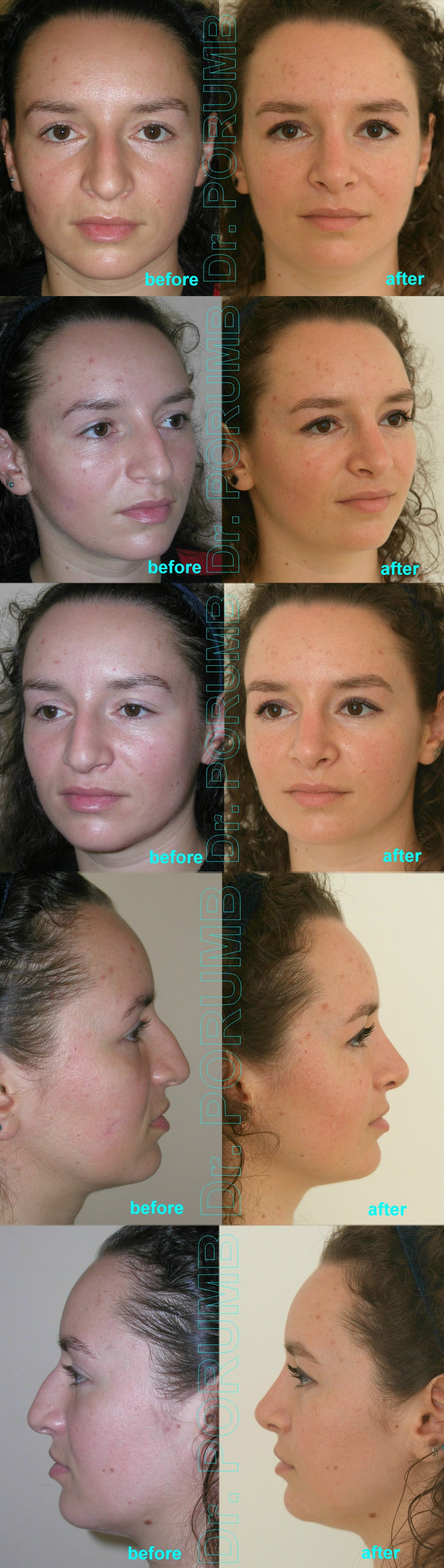 Aceste fotografii arata multiplele tipuri de rinoplastii practicate de Dr Porumb Serban. Fotografiile inainte si dupa operatie sunt cea mai buna metoda da va face o idee despre ce fel de rezultate sa va asteptati daca veti face o interventie cu Dr Porumb Serban, toate cazurile fiind operate in exclusivitate de dansul, de la inceputul pana la sfarsitul operatiei.